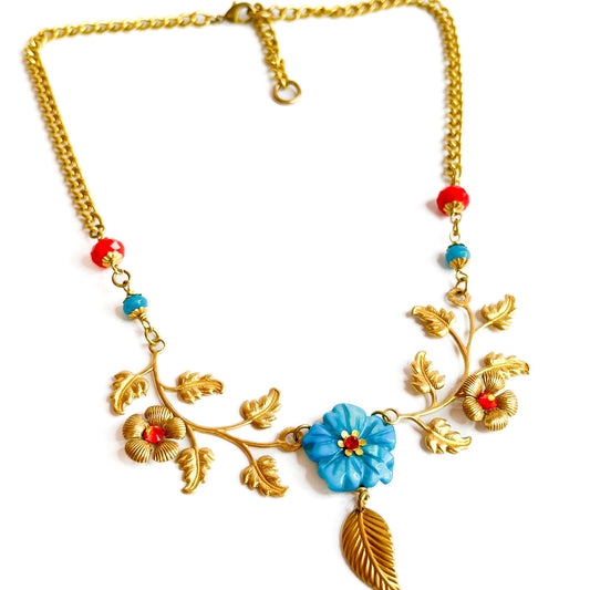 Collar Primavera Floral Nácar Azul y Ramas Doradas