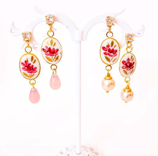 Aros camafeo floral pintado a mano con perla | Regalo Día de la Madre