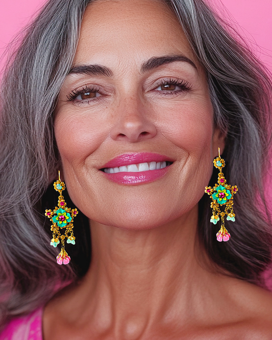 Jardín Suspendido – Pendientes Chandelier Florales Turquesa y Fucsia