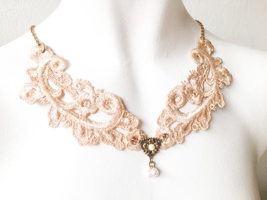 This collection is created from textile elements recovered from flea markets, haberdasheries, and fairs around the world. Pieces of embroidered guipure, lace appliqués, lace, and embroidery are combined with metal elements, pearls, and other materials to create unique and very feminine pieces.