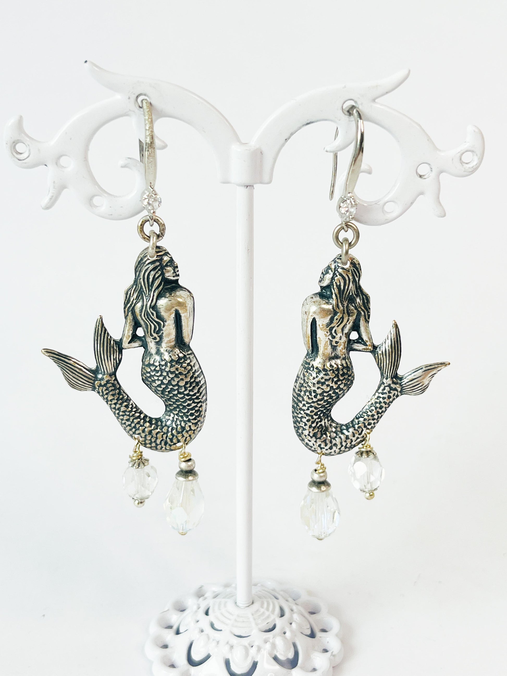 Materials: silver-plated brass mermaids, zircons and faceted crystals.
