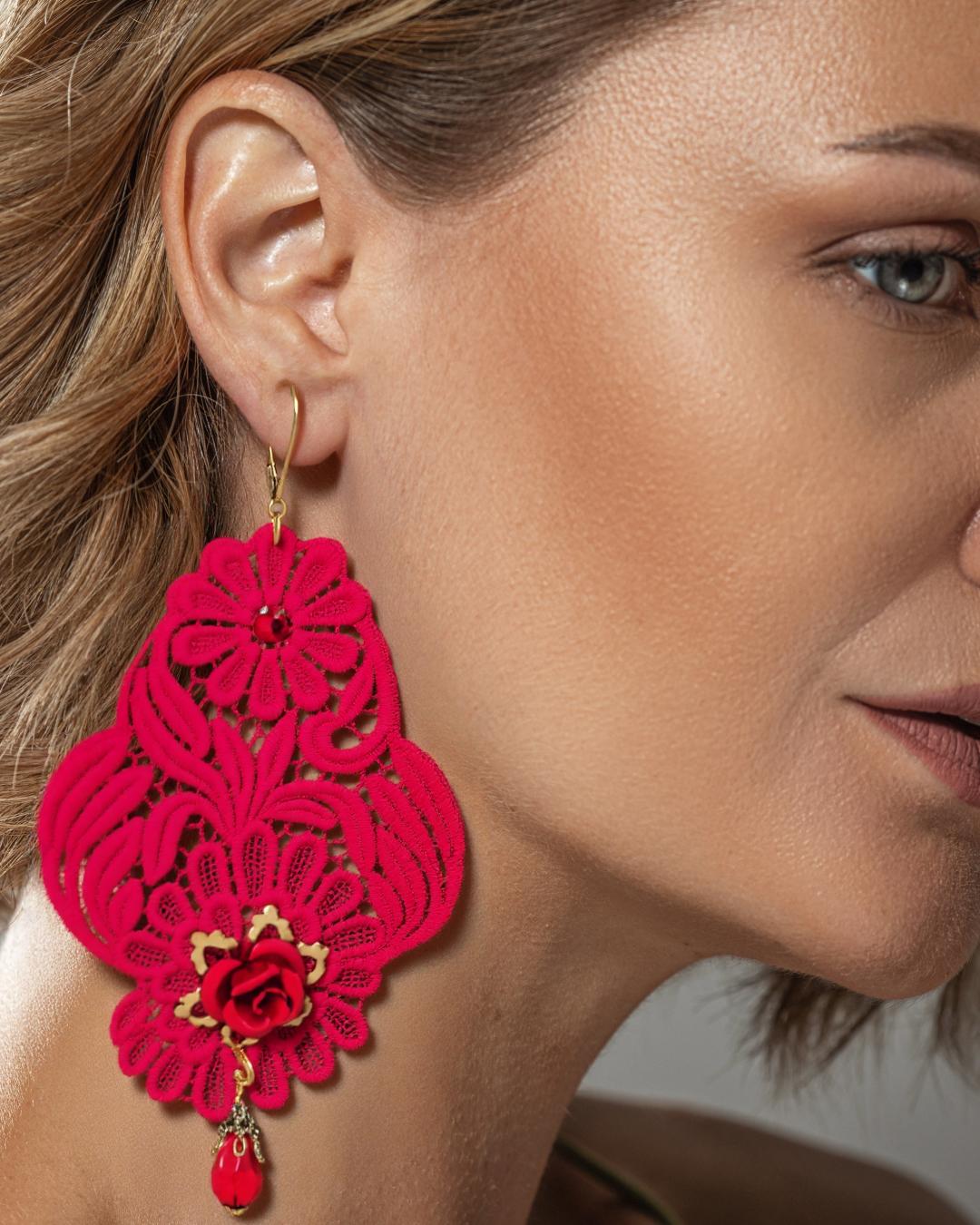 Estos pendientes son una declaración de estilo. Confeccionados a partir de un delicado encaje bordado en rojo intenso y embellecidos con una rosa central, destacan por su tamaño imponente y carácter único. Una pieza espectacular, pensada para mujeres que desean brillar y no pasar desapercibidas en ninguna ocasión.
