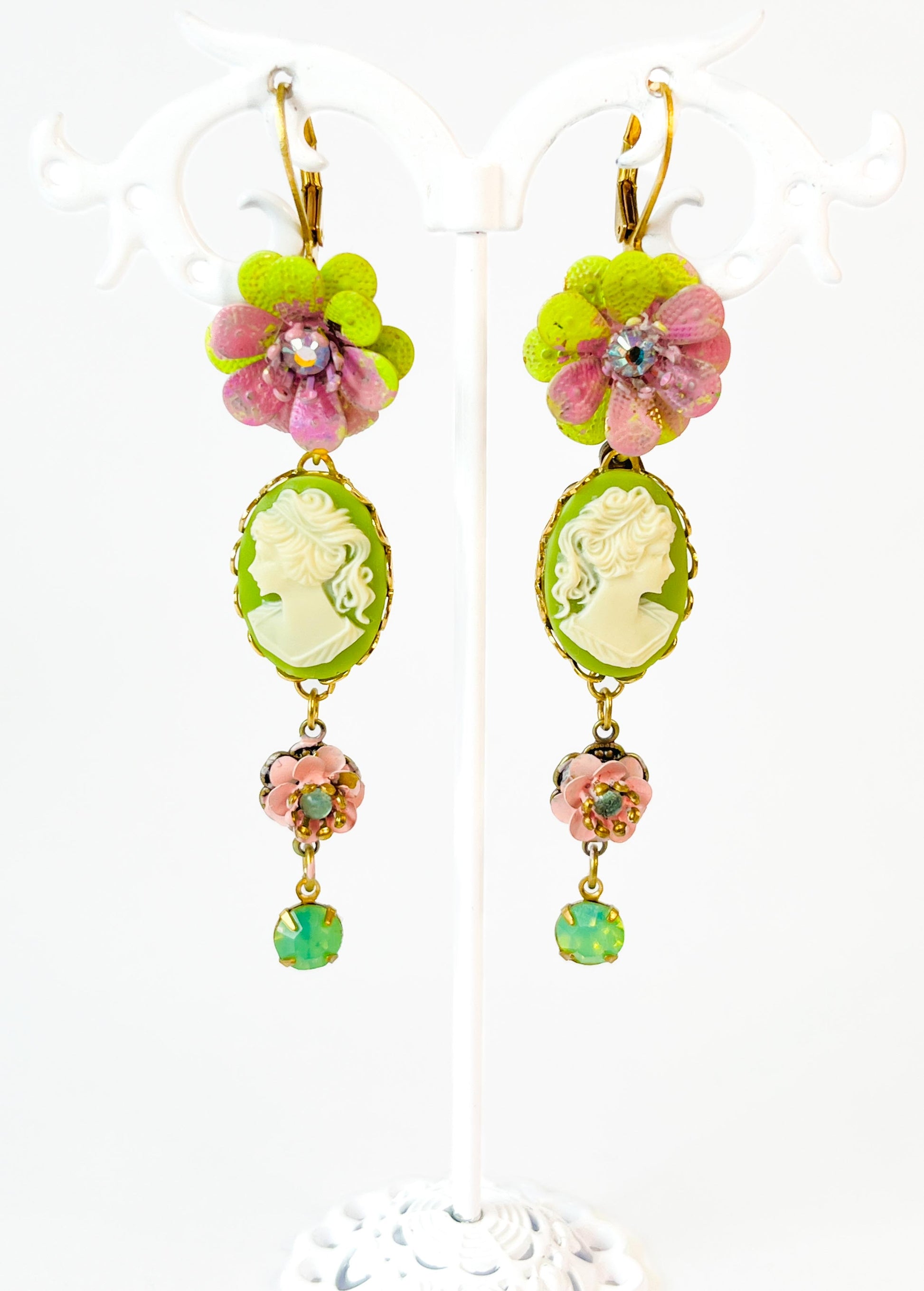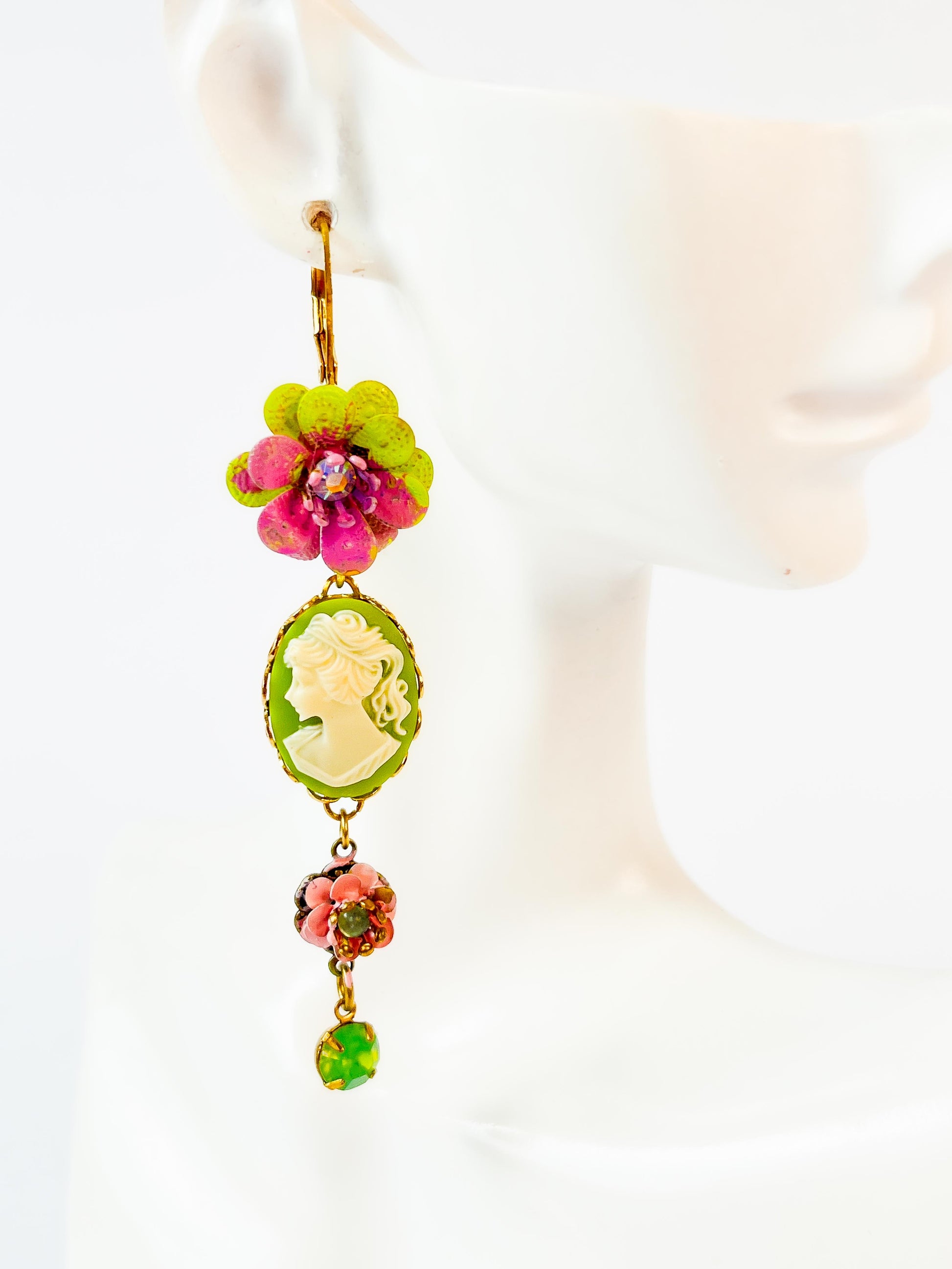 Pendientes lineales con camafeo y flores esmaltadas en tonos de rosado y lima, que combinan delicadeza y frescura en un diseño lleno de encanto. El gancho cerrado francés, libre de níquel, aporta comodidad y seguridad, convirtiendo esta pieza en un accesorio versátil y elegante para cualquier ocasión.
