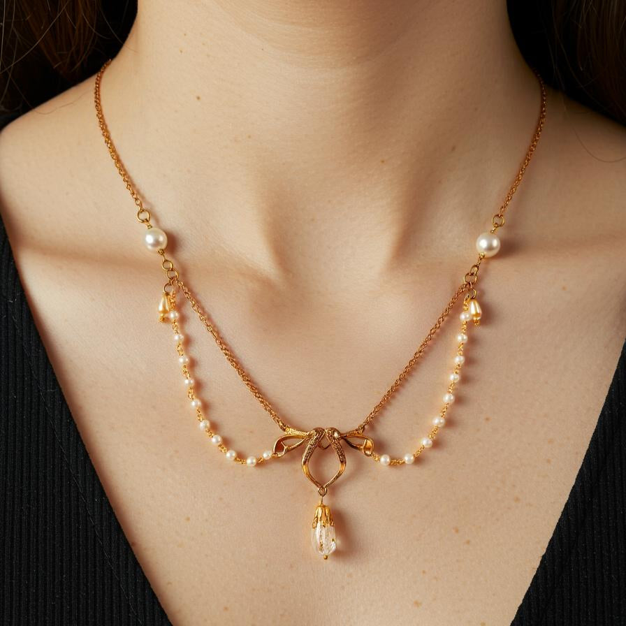 Un festón dorado de líneas suaves se entrelaza con delicadas perlas de vidrio, evocando la gracia y el refinamiento de la Belle Époque. En el centro, un colgante inspirado en el Art Nouveau aporta ese aire romántico y femenino que convierte a Marguerite en una joya única: elegante, atemporal y lista para realzar cualquier look con un destello dorado y perlado.