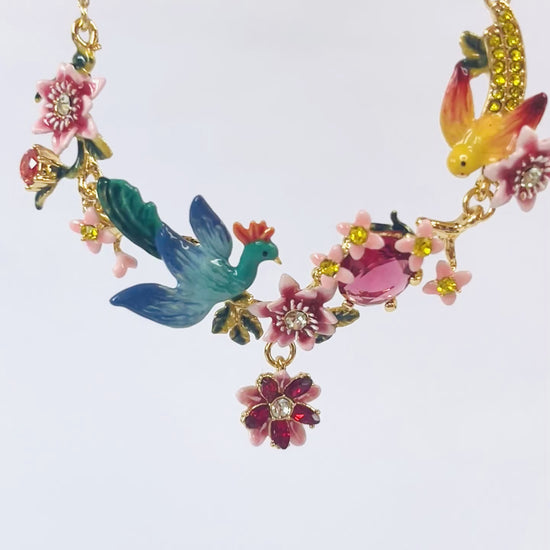 Collar llamativo de la casa francesa Les Nereides adornado con un pavo real en tonos azules y una insignia de color cálido, junto con un cristal facetado rosa. Flores rosas y pasionarias adornan la pieza. En medio de un exuberante Edén, una multitud de coloridas aves se mezclan con la exótica flora. Una impresionante serpiente y una hoja de parra adornan este conjunto, simbolizando la colección Árbol de la Vida.