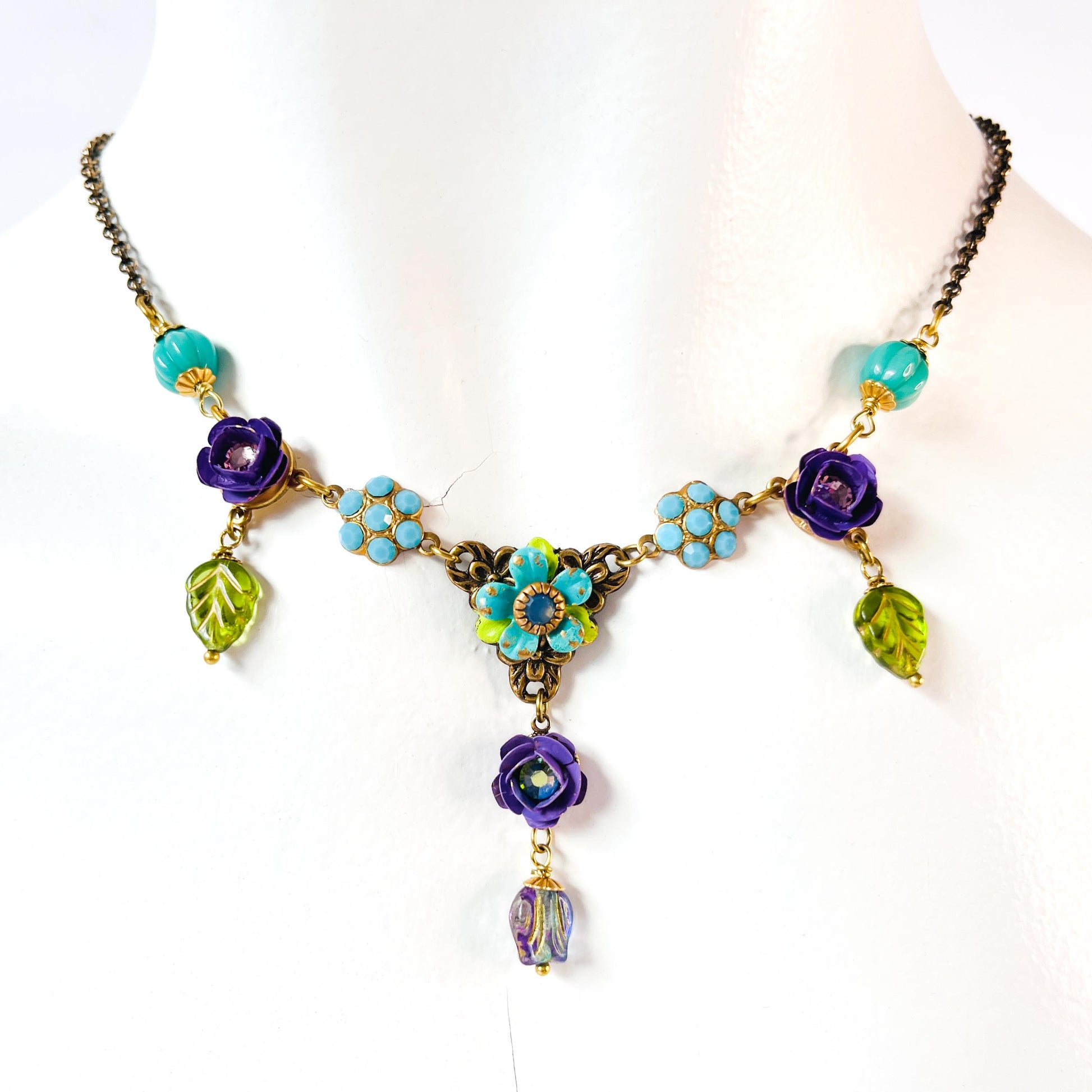 Jardín de Luna - Collar Floral con Rosas Violeta y Cristales Turquesa