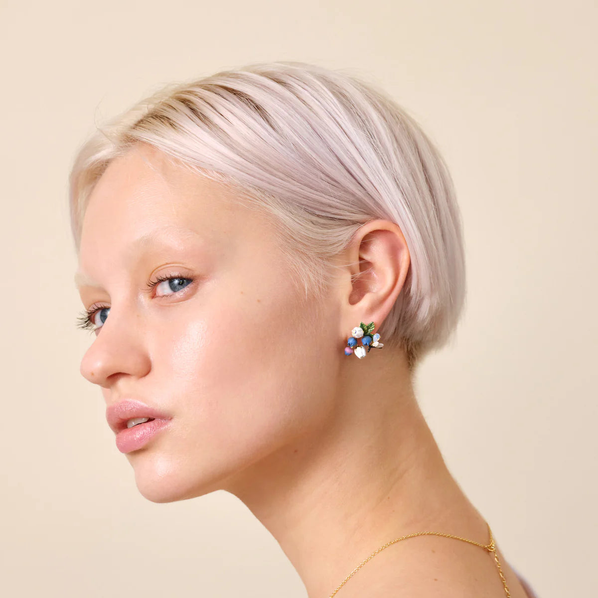 Sumérgete en el brillo mágico de la naturaleza con estos pendientes. Cada par es una fusión artística de arándanos frescos, delicadas flores blancas y una destellante luciérnaga. Los arándanos representan la dulce frescura de la estación estival, mezclándose con las flores blancas en una delicada danza para crear una armonía natural y poética. La luciérnaga, cuyo cuerpo está formado por una gota de cristal opalescente, añade un toque de encanto y un brillo centelleante a este conjunto, capturando el encantador espíritu de la noche. Estos pendientes añaden un toque de misterio y encanto, ofreciendo un look chic y cautivador, perfecto para una noche memorable bajo las estrellas.