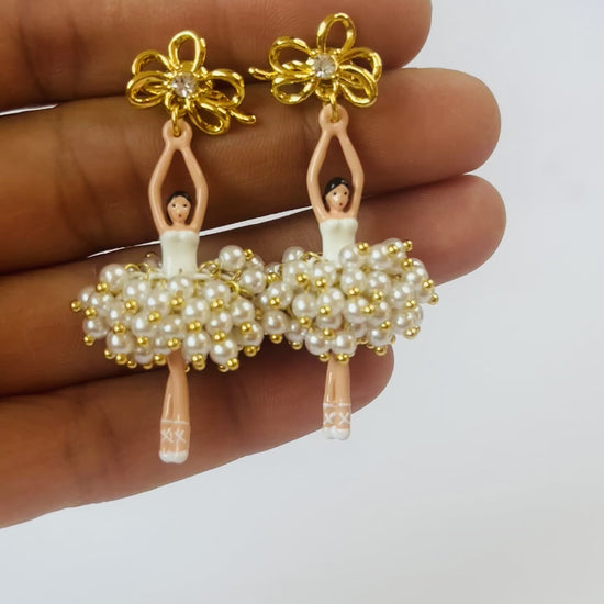 Pendientes colgantes de bailarina esmaltada a mano, vestida con corsé blanco y tutú de pedrería, lazo de latón bañado en oro.
