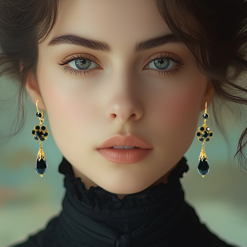 Pendientes en forma de lágrima negra inspirados en la joyería de ónix y azabache del siglo XIX. Su diseño elegante y sobrio los convierte en un accesorio versátil: perfectos para el día a día y a la vez ideales para ocasiones especiales. Una pieza que encarna la sofisticación atemporal en cada detalle.