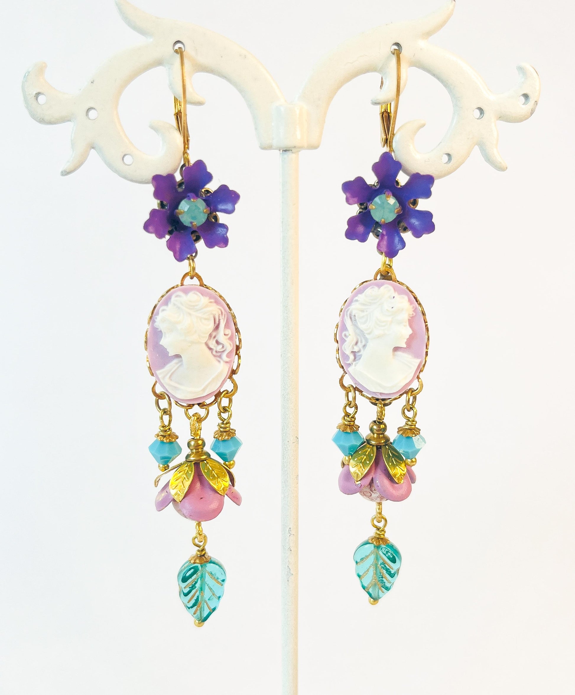 Materiales: Camafeo en resina, flores esmaltadas, flores de vidrio checo, gancho cerrado francés libre de níquel.