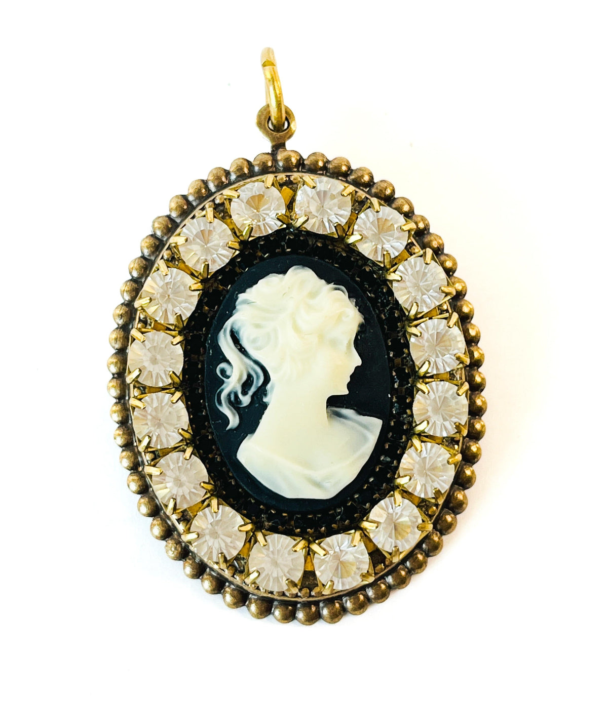 Broche de estilo camafeo en blanco y negro, con un delicado relieve de mujer rodeado por un borde de cadena de pedrería que aporta brillo y sofisticación. Su diseño versátil incorpora pasador y argolla, permitiendo usarlo como broche, collar o choker según la ocasión. Una pieza multiuso, elegante y original, inspirada en la joyería clásica de época y pensada para quienes aprecian el encanto de los detalles antiguos.