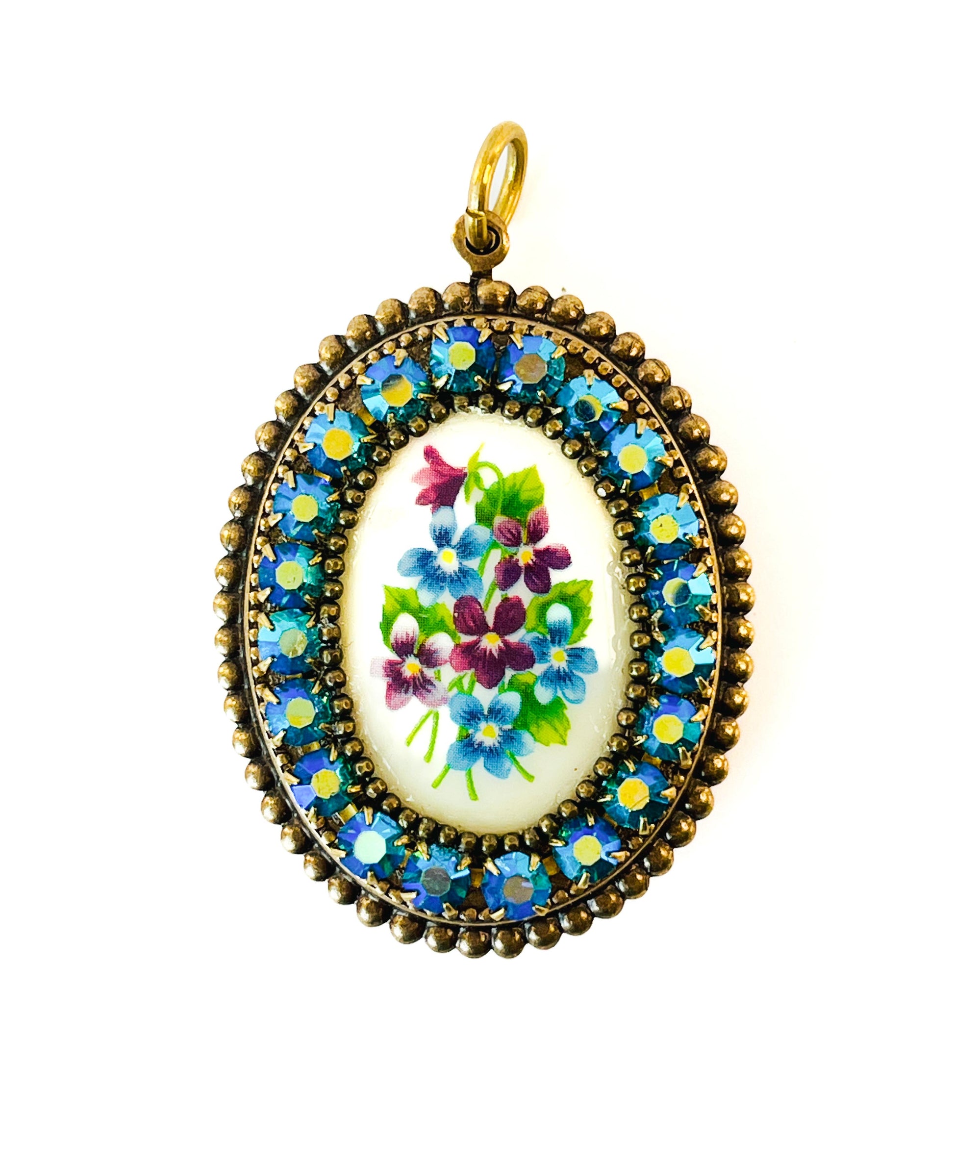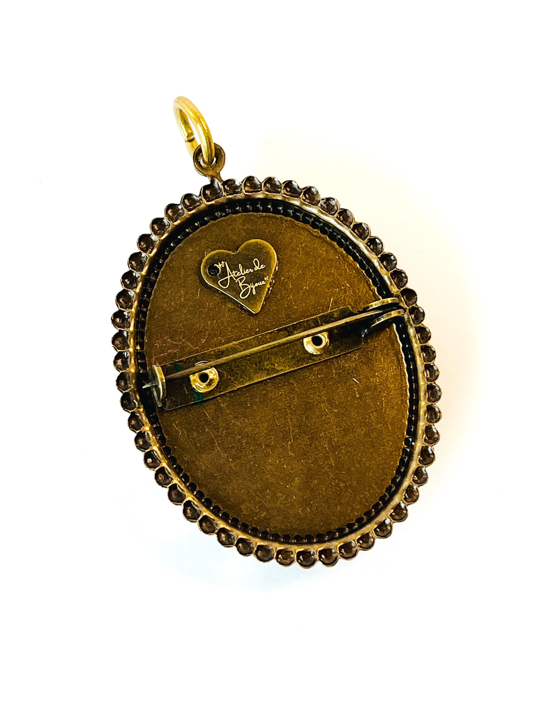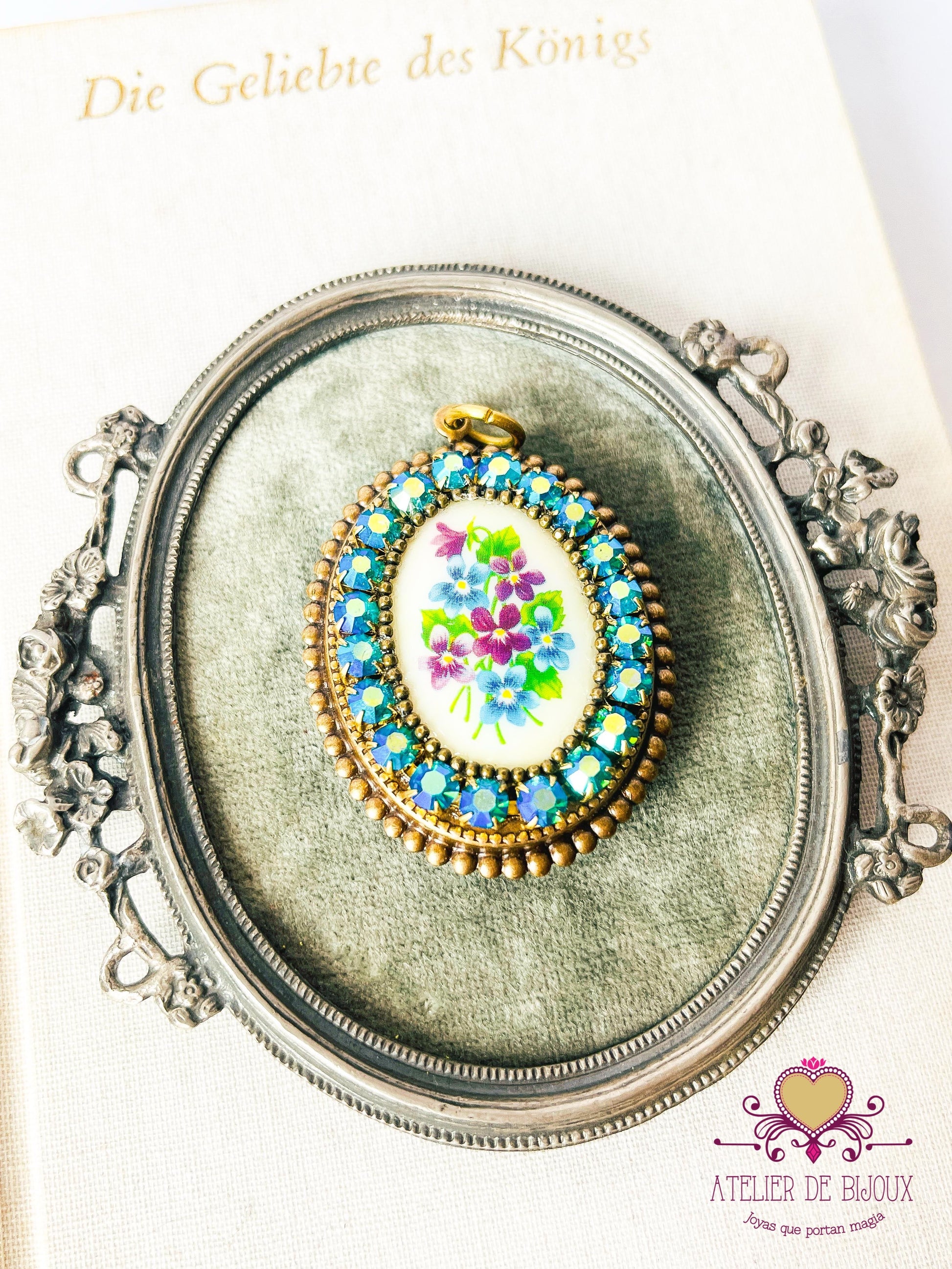 Serie de prendedores estilo vintage con camafeo vintage floral, cadena de cristal Swarovski y detalles metálicos. Cada pieza incluye una argolla en la parte superior, lo que permite usarla también como colgante al añadir una cadena o cinta.