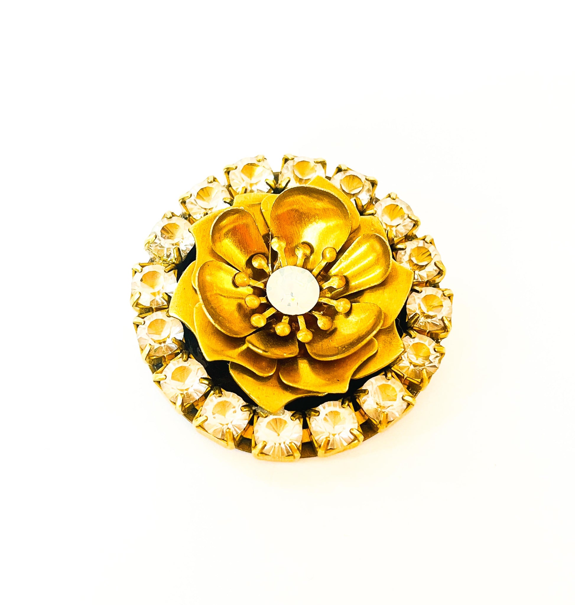 Eleva una blusa, un vestido, chaqueta o cualquier prenda incluso un bolso con este hermoso broche dorado con rosa central de varias capas, rodeada de una hermosa y brillante cadena de pedrería vintage. Todos estos elementos encontrados en un antiguo almacén de insumos de joyería vintage.
