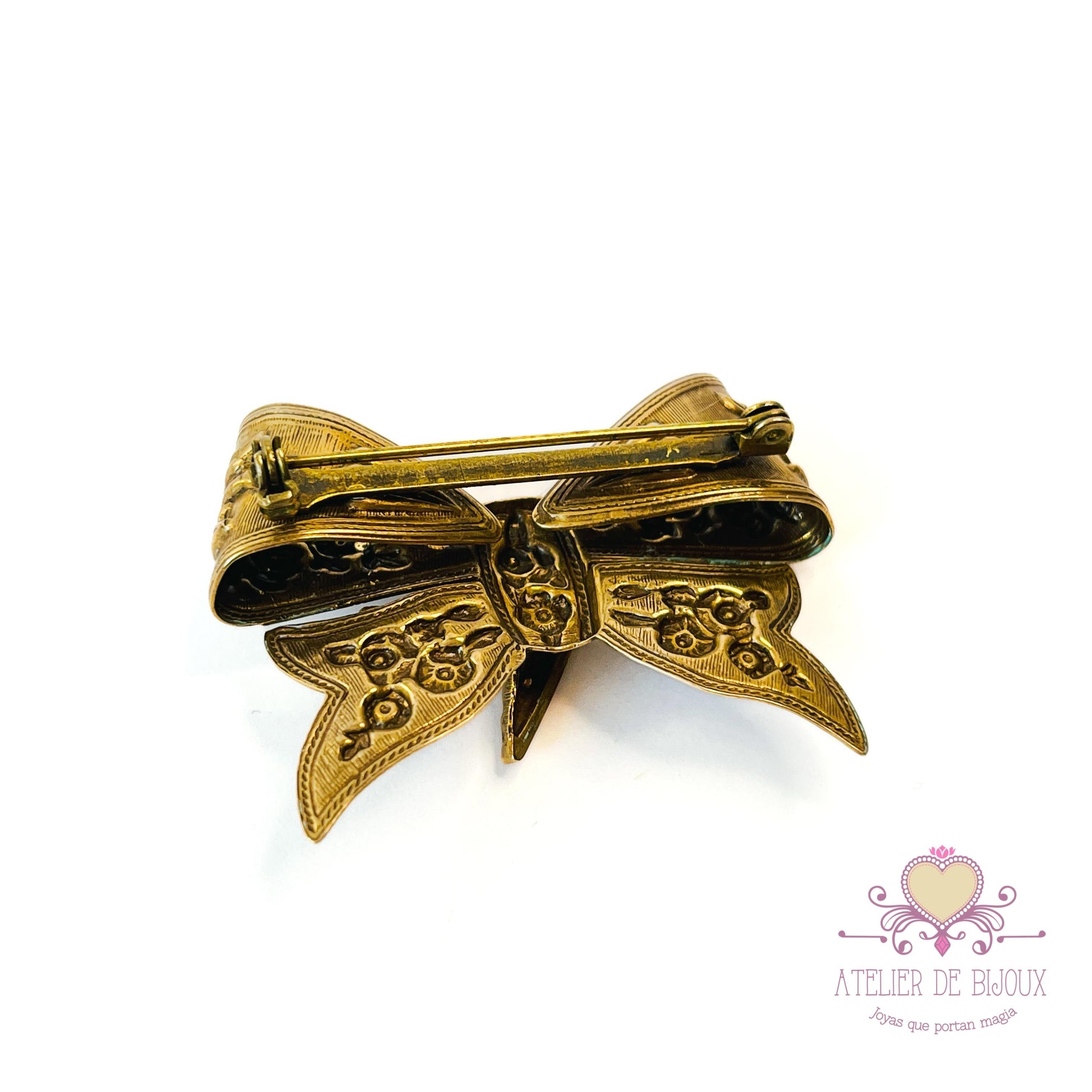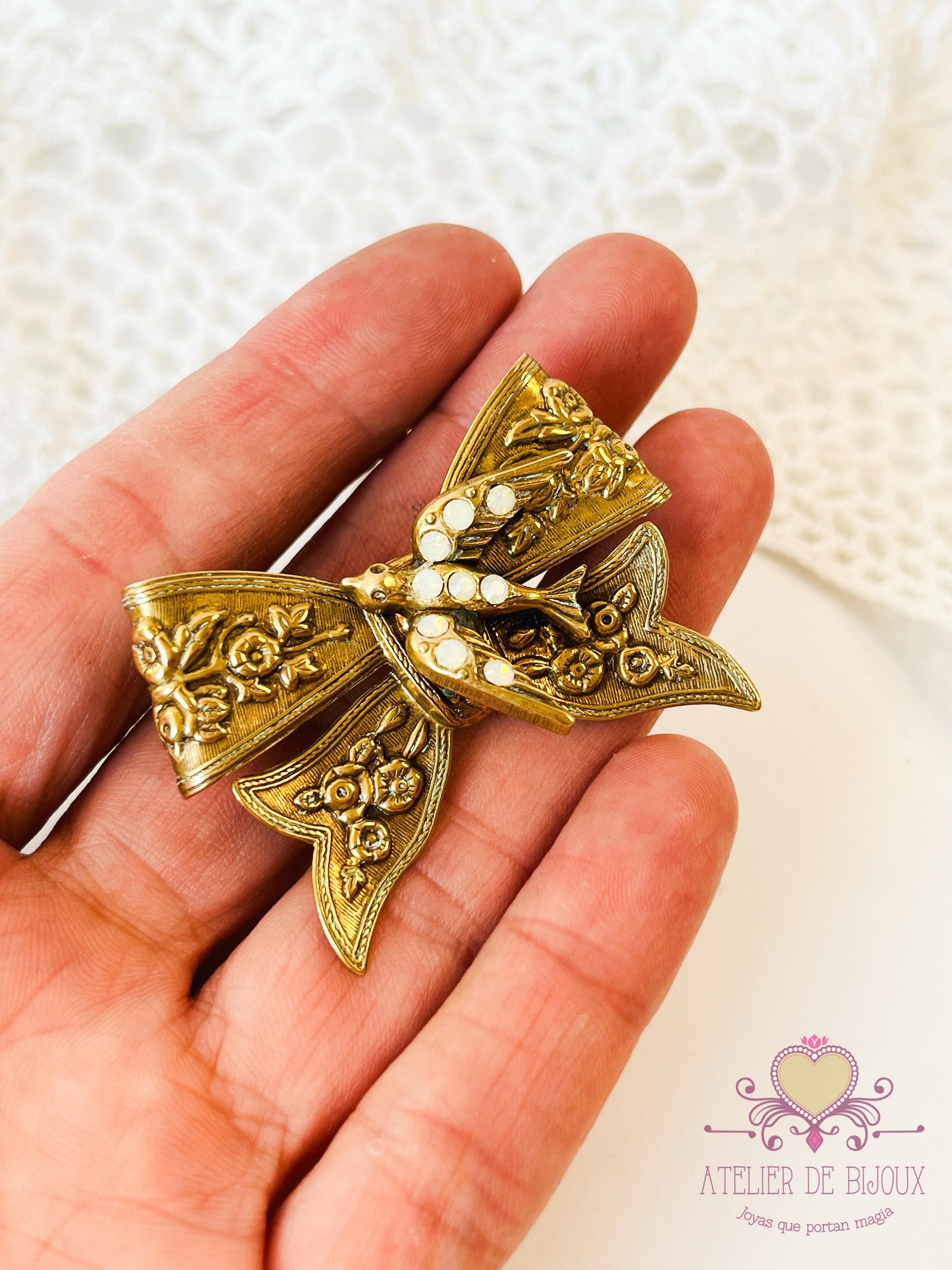 Sumérgete en el encanto de la naturaleza con este exquisito broche, con la elegante forma de un delicado lazo. Adornado con intrincados motivos florales y caprichosa ave, encarna un cálido tono dorado que evoca nostalgia y gracia. Cada detalle está cuidadosamente elaborado, invitándote a lucir una pieza que narra una historia de belleza y emoción. Perfecto para añadir un toque de fantasía a cualquier atuendo, este broche no es solo un accesorio; es un tema de conversación. Una encantadora adición a tu colección, que promete despertar la alegría y realzar tu estilo.