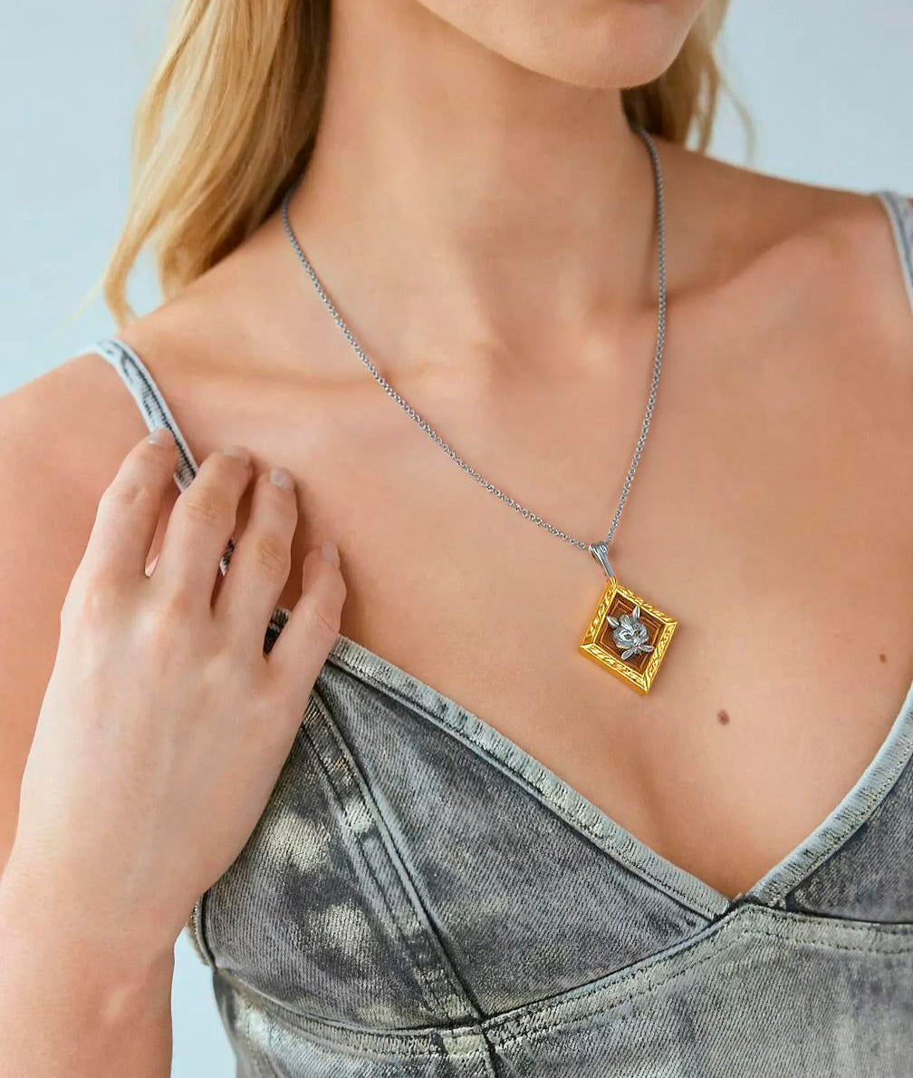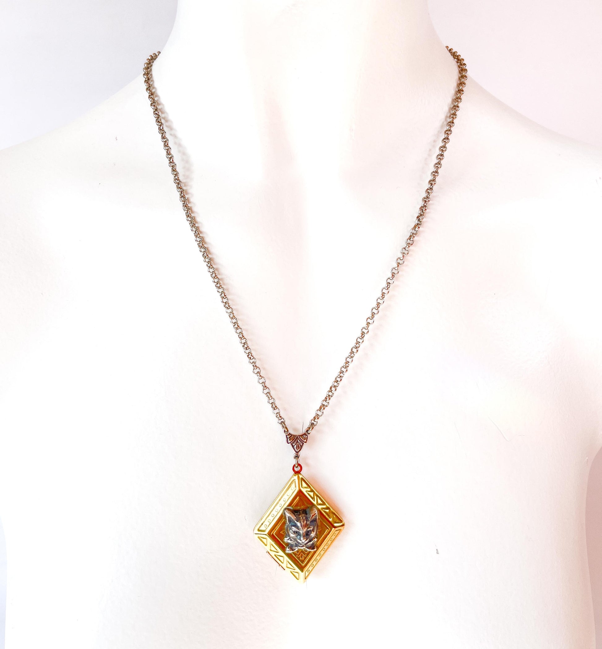 Una pieza única que combina ternura y estilo vintage. Este relicario de latón con forma de rombo grabado luce un delicado gatito en relieve, acompañado de una cadena con baño de plata que aporta contraste y luminosidad. Un amuleto encantador para llevar recuerdos, deseos o simplemente la compañía simbólica de tu pequeño felino.